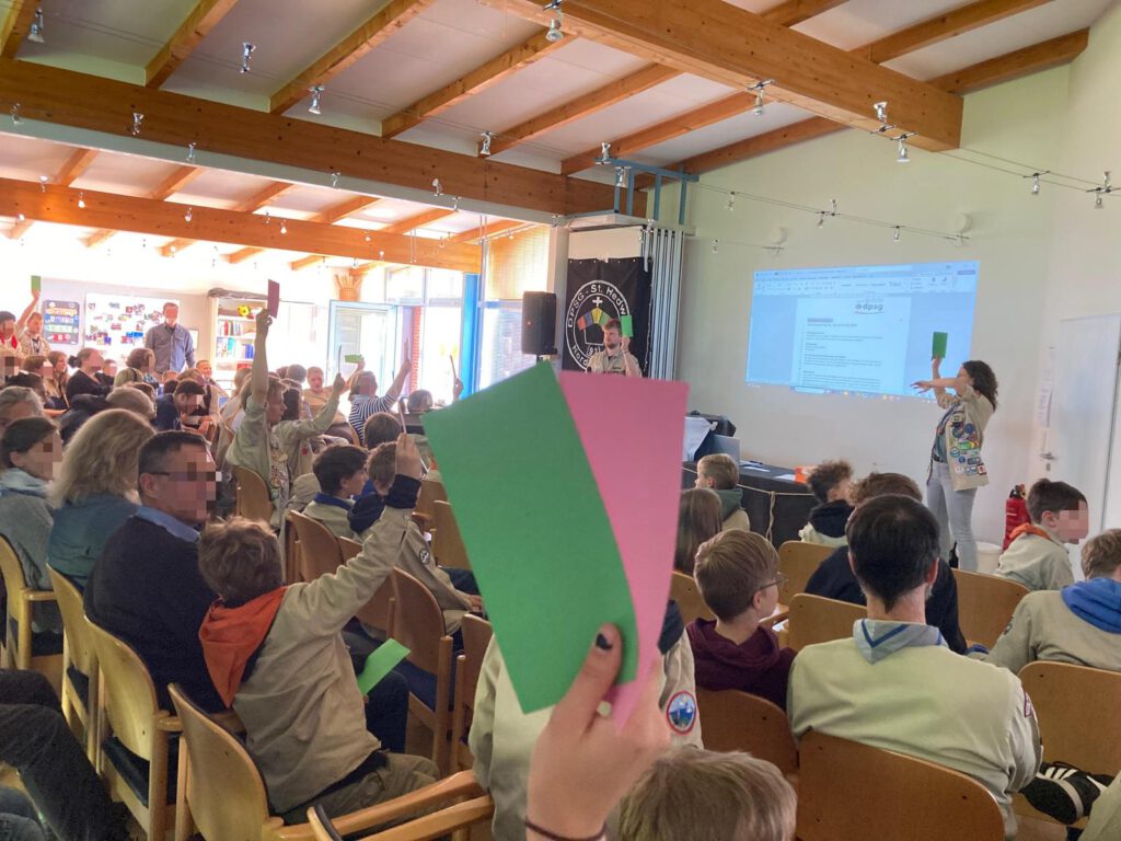 Vor kurzem hat unser jährlicher Stammestag stattgefunden. Dafür haben wir uns mittags getroffen und sind nach einem kleinen Bewegungspiel in die Stammesversammlung gestartet. Der Vorstand hat vom vergangenen Stufenjahr berichtet, es gab einen Gallery-Walk, bei dem jede Gruppe ein Plakat mit den Erlebnissen des letzten Jahres vorbereitet hat und auch Wahlen und Anträge standen auf der Agenda. Unter anderem wurde für eine Jubiläumsfeierlichkeit im Jahr 2027 gestimmt und für die Anschaffung eines mobilen Pizzaofens. Während wir uns von ein paar Leitenden verabschieden mussten, durften wir aber auch mehrere neue Leitende in unserer Leitungsrunde begrüßen. Außerdem haben wir einen neuen Stammesvorstand gewählt.